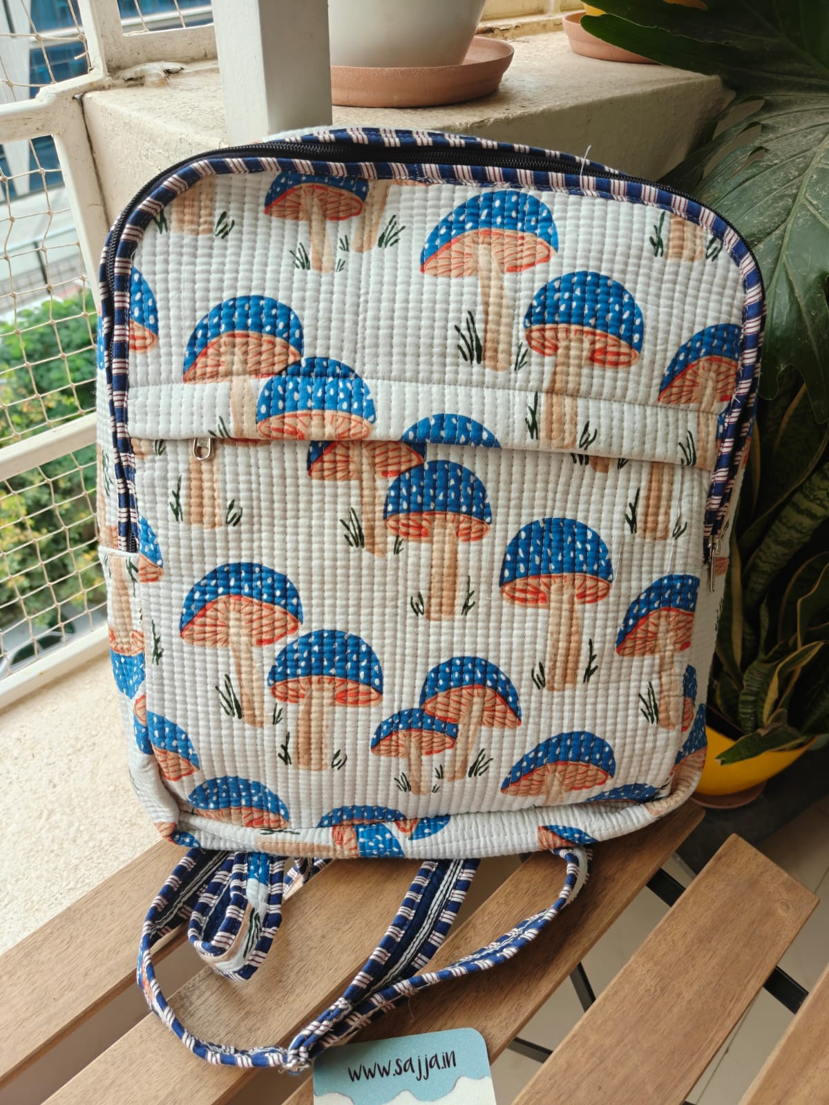 Sajja Quilted block print back pack - Laptop back pack - Trendy Mushrooms